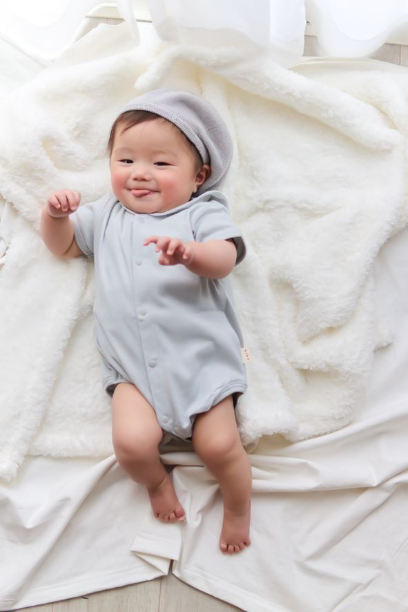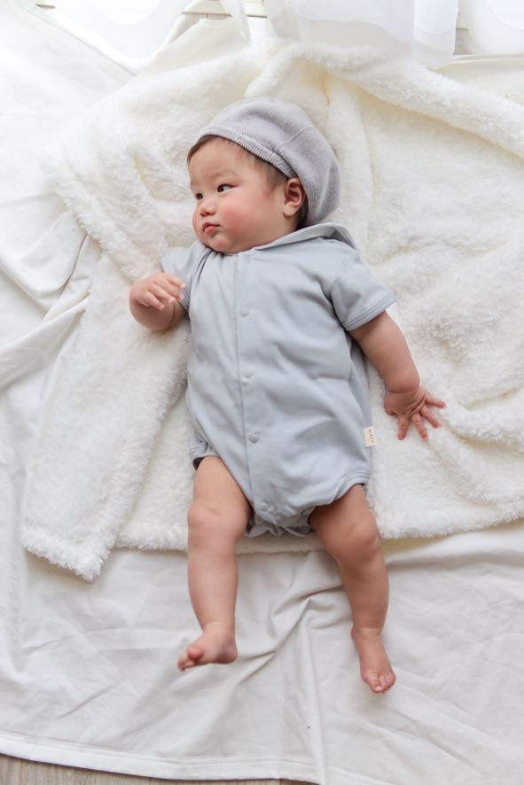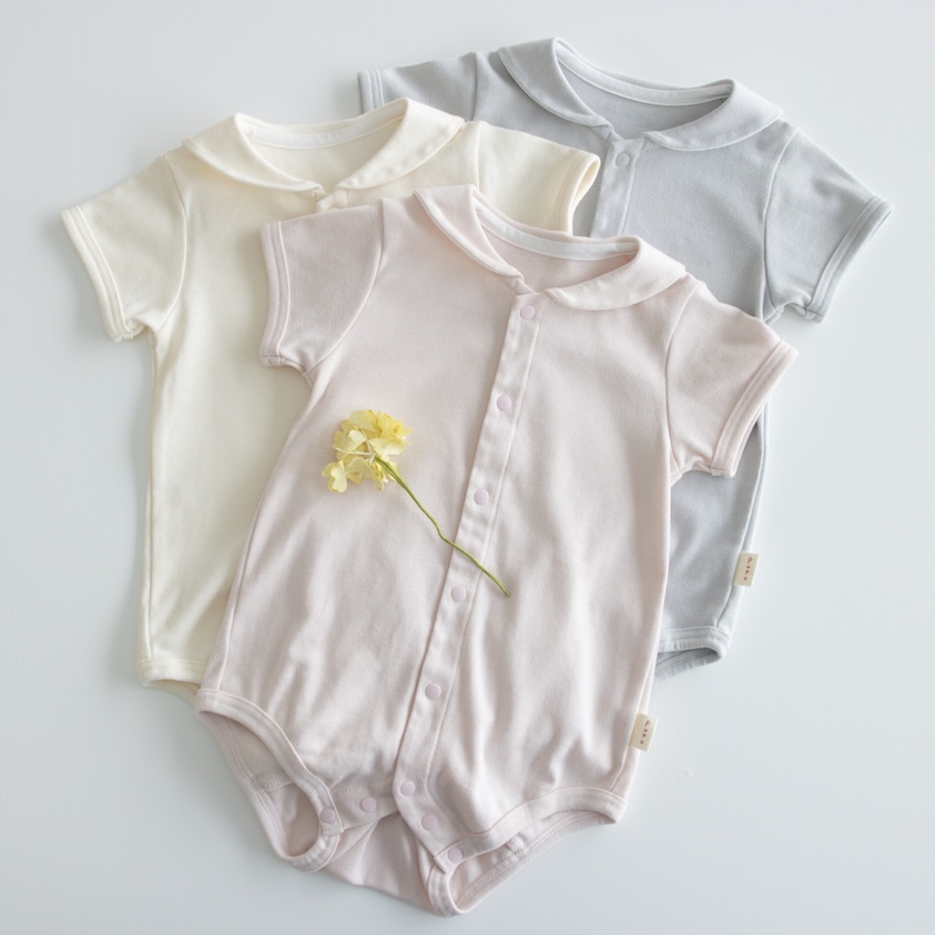 帶有水手領的開襟包屁衣。低飽和色系,色調溫暖柔和。